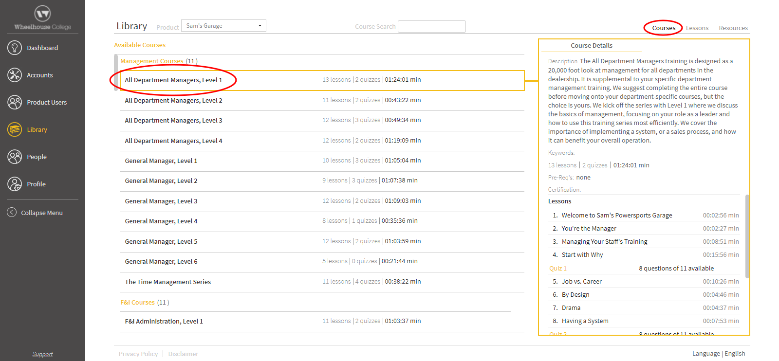 From the Courses view of the library tab, product owners have an overview of every course, organized by department, within their product or products. Clicking the Course Name will open the Course Details panel to the right, where you will see summary information at the top, such as a description, the number of lessons and quizzes, the expected duration, any pre-requisites, and certifications earned upon course completion.