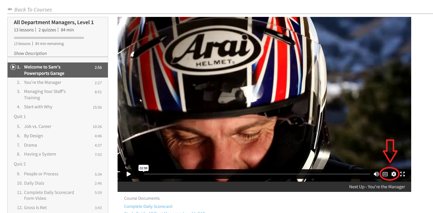 To turn on closed captions or subtitles in available languages while viewing a video, click on the CC (Closed Caption) icon and then click on the gear (Settings) icon inside the video and select the language of your choice as indicated in the screenshot below: