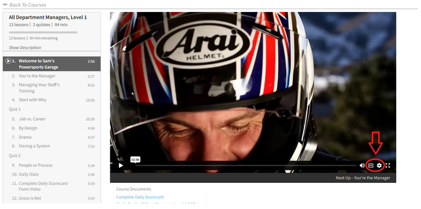 Pour activer les sous-titres dans les langues disponibles lors du visionnage d'une vidéo, cliquez sur l'icône CC (sous-titres codés) puis sur l'icône d'engrenage (paramètres) à l'intérieur de la vidéo et sélectionnez la langue de votre choix comme indiqué dans la capture d'écran ci-dessous :